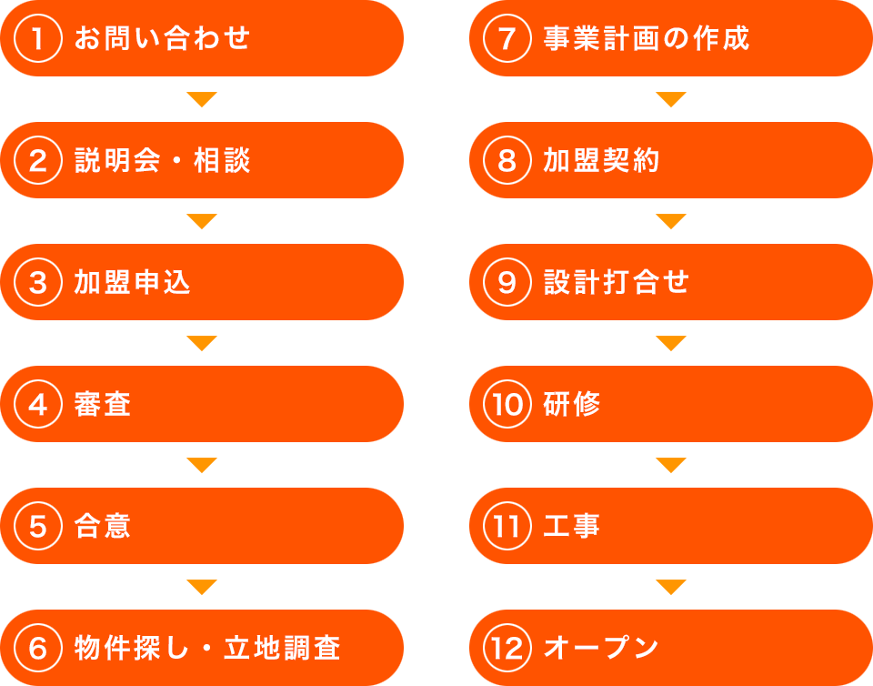 独立支援制度では、応募・選考を経て社員として勤務を開始し、一定期間の実務経験と研修を積んだ後、フランチャイズオーナーとして独立する流れとなります。勤務期間中に適性や意欲を確認しながら進められるため、双方にとってミスマッチが起こりにくい点も特徴です。